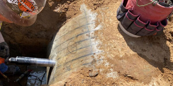 As part of the evaluation of the existing storm drain pipe, a pit was excavated to expose part of the pipe. Geophysical equipment was used to identify the locations of reinforcement. Cores were then taken from the pipe to provide specimens for compression testing and to identify the sizes of reinforcing bars. With this data, analyses were performed by our firm to evaluate the loading capacity of the pipe and confirm that future traffic would not over-stress the pipe.