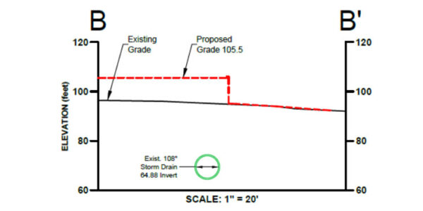 Proposed site development called for raising the grade by up to 12 feet above the existing 108” RCP. Review of old construction plans indicated the pipe was not designed to support such high loads. To mitigate surcharging, soils above the pipe were removed. Geofoam blocks having a total thickness of 6 feet were placed over the pipe and beyond. The reduction in soil weight allowed for the addition of fill soil over the original grade without overloading the pipe.