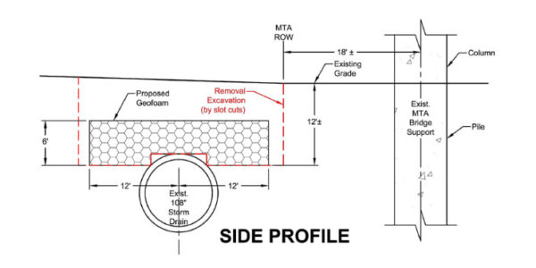 Specific geotechnical challenges included using lightweight geofoam blocks for backfilling a large retaining wall to avoid surcharging an existing RCP storm drain pipe, 108 inches in diameter. Several other existing utilities required protection in place. The project also entailed a design that did not impact the existing foundations of the MTA Elevated rail line bridge and provided a stable, well-drained surface to support the practice fields.