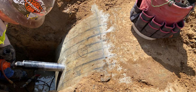 As part of the evaluation of the existing storm drain pipe, a pit was excavated to expose part of the pipe. Geophysical equipment was used to identify the locations of reinforcement. Cores were then taken from the pipe to provide specimens for compression testing and to identify the sizes of reinforcing bars. With this data, analyses were performed by our firm to evaluate the loading capacity of the pipe and confirm that future traffic would not over-stress the pipe.