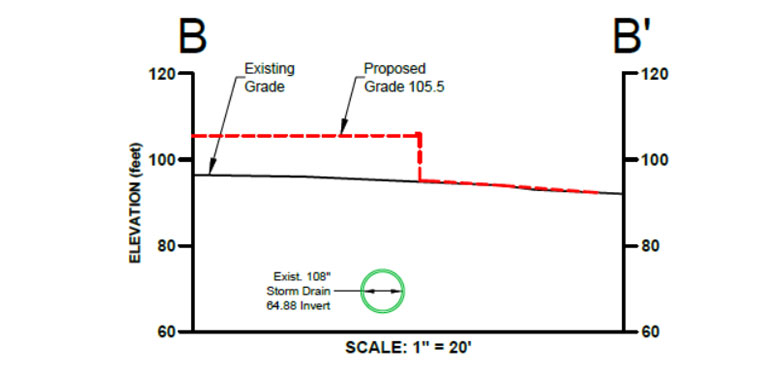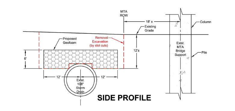 Proposed site development called for raising the grade by up to 12 feet above the existing 108” RCP. Review of old construction plans indicated the pipe was not designed to support such high loads. To mitigate surcharging, soils above the pipe were removed. Geofoam blocks having a total thickness of 6 feet were placed over the pipe and beyond. The reduction in soil weight allowed for the addition of fill soil over the original grade without overloading the pipe.